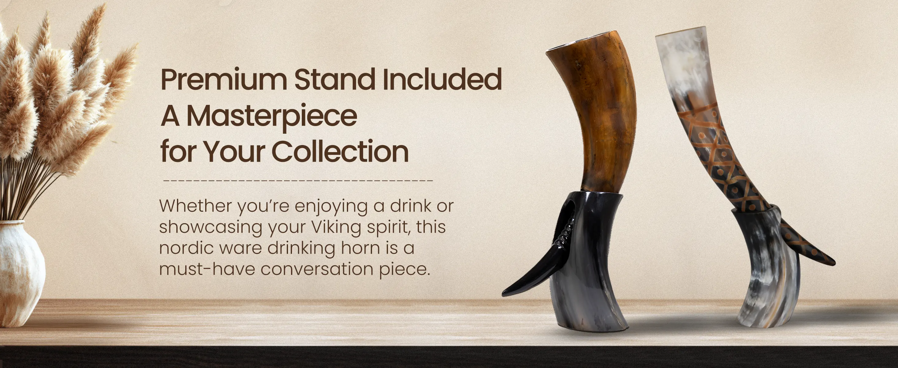 Elevate your drinking experience with our premium branded horn stand, crafted to combine durability and style. Designed to securely hold your authentic drinking horn, this stand ensures stability while showcasing its natural beauty. Made from high-quality materials, it features a sleek and polished finish that complements any setting, whether for display or everyday use. Perfect for Viking enthusiasts, collectors, or gifting, our branded horn stand adds a touch of elegance and authenticity to your horn collection.